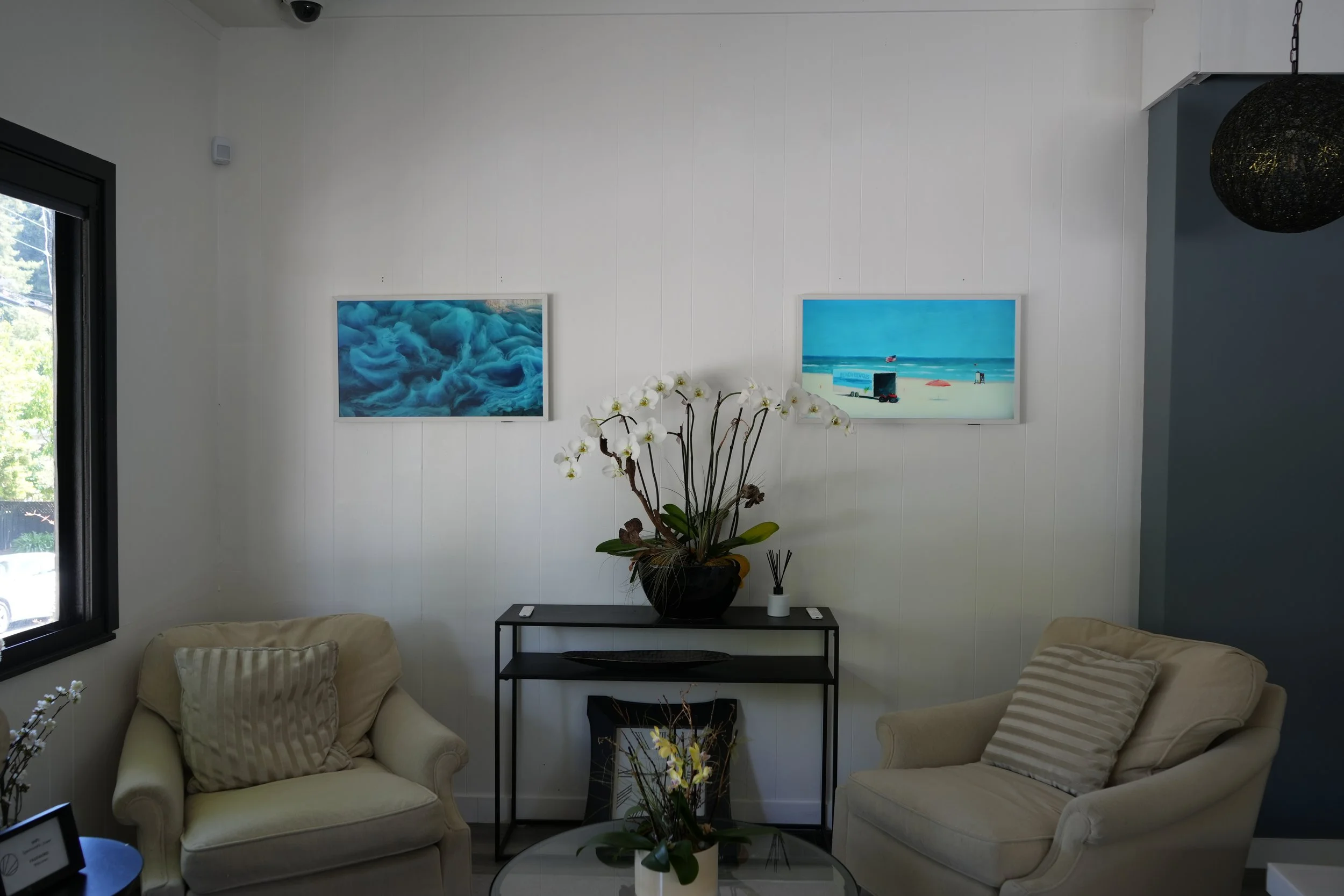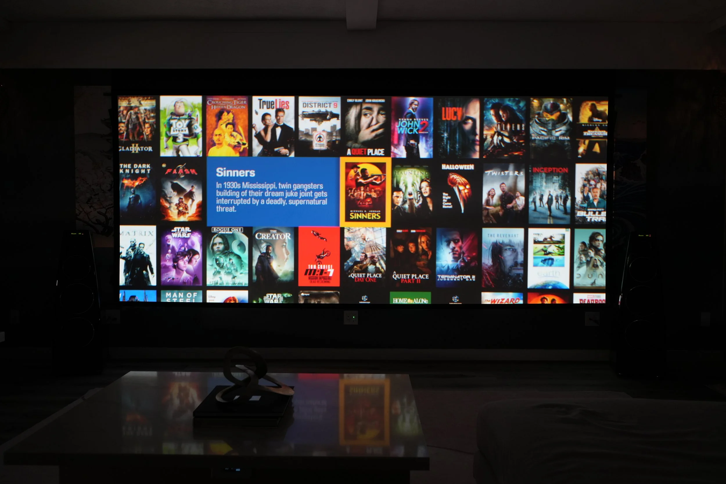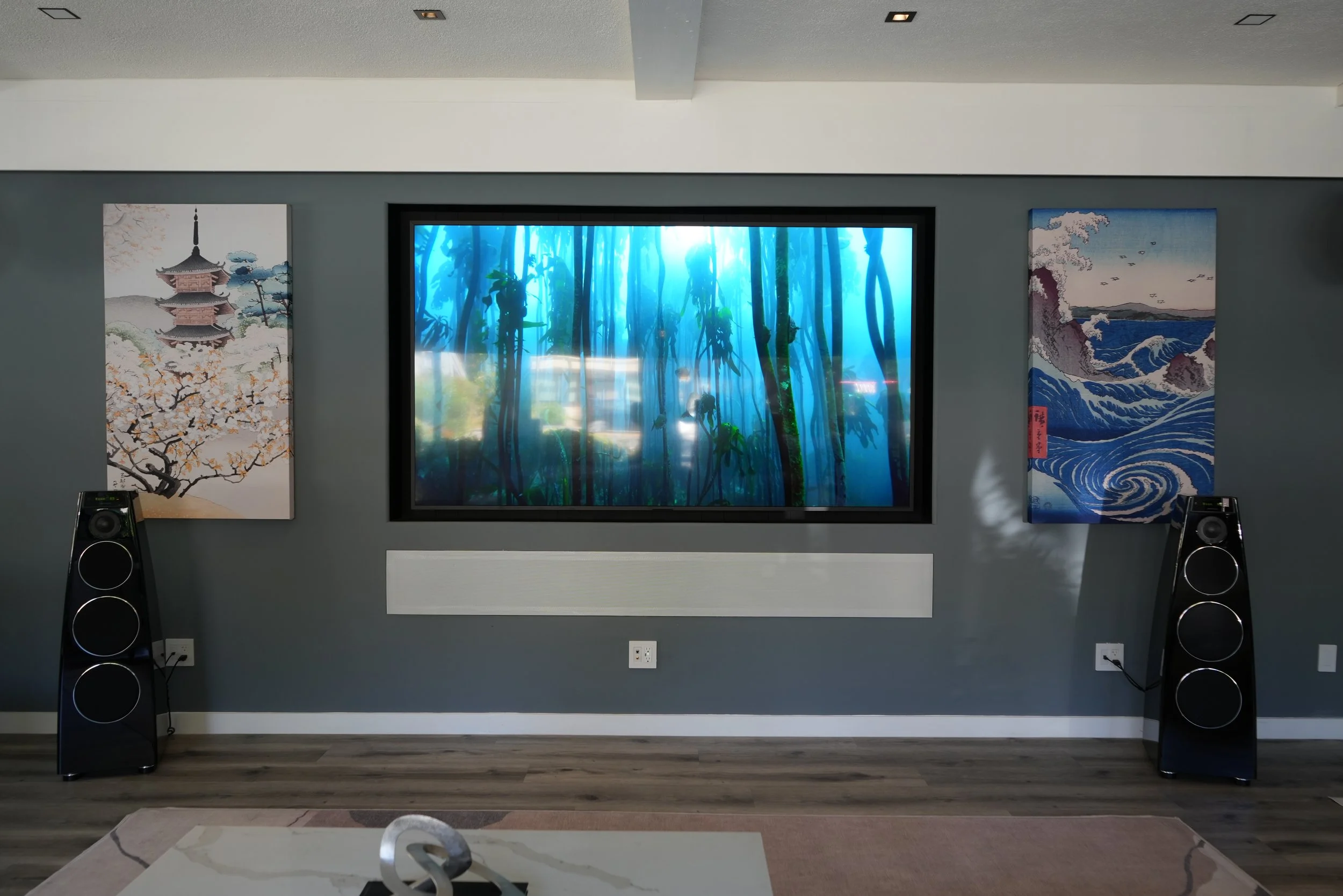 The Kyoto Room features a Sony XR-98X90L 98” 4K HDR TV alongside a Barco HODR CS projector with a right-angle lens housed in a custom-built coffee table, with a Barco Heimdall CS upgrade on the way. A 160” Seymour Screen Excellence acoustically transparent motorized screen delivers a true theater experience. Audio is driven by a Steinway Lyngdorf MP-60 2.1 processor and Meridian DSP-7200SE floorstanding speakers, supported by four subwoofers—two James Power Pipe in-floor units and two SVS SB16Ultra 16” subs. The system runs on a Kaleidescape Strato V with Dolby Vision, fully automated through Savant and Screen Innovations motorized black out shades for seamless control.